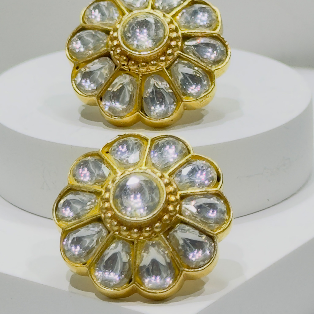 These handcrafted 925 silver earrings from Amaahe reinterpret timeless polki elegance through a contemporary floral silhouette. The center round stone radiates outward into petal-like pear-shaped polki CZs, creating a luminous flower motif. Finished in rich 22K gold plating, these studs strike the perfect balance between regal and wearable — ideal for festive occasions, weddings, or elevating your everyday ethnic attire.