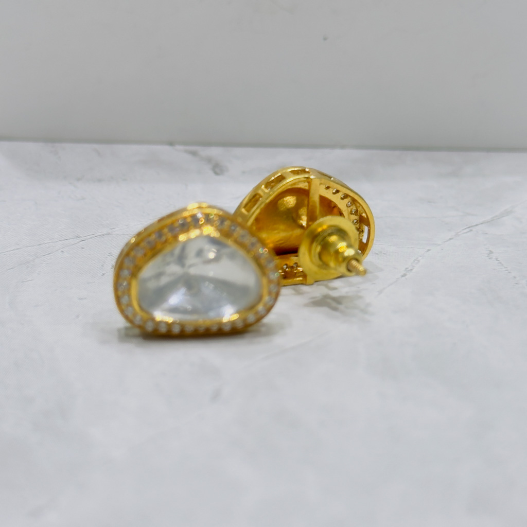 Radiating understated grace, these Polki-inspired earrings feature a clear quartz centerpiece framed with a delicate halo of sparkling cubic zirconia. The 925 Sterling Silver base is finished in high-gloss gold plating for a luxurious touch. Perfect for festive occasions or elegant daily wear, these tear-drop studs embody the essence of timeless Indian elegance.