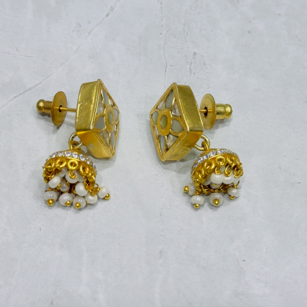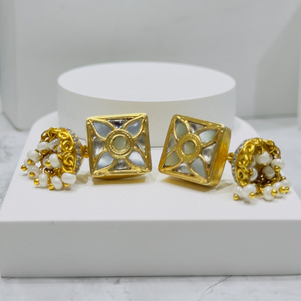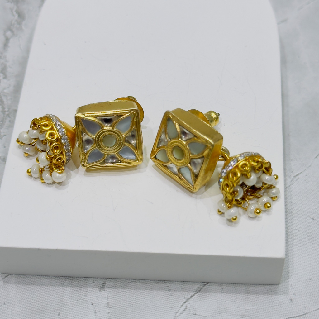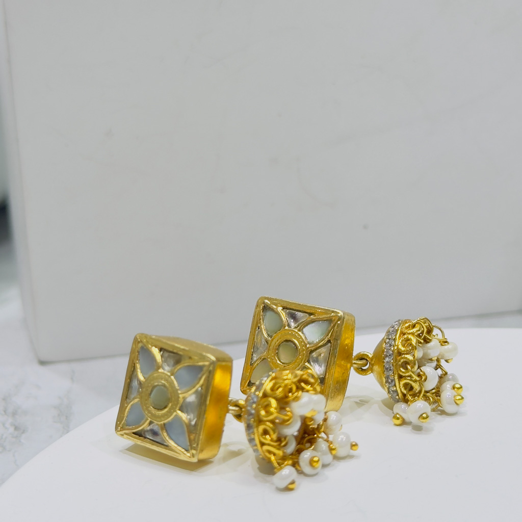 A graceful handcrafted pair of drop earrings in 925 Sterling Silver, featuring Polki style uncut stones bordered by delicate mini pearls. The design blends Mughal opulence with subtle contemporary detailing, perfect for festive or elegant evening wear.