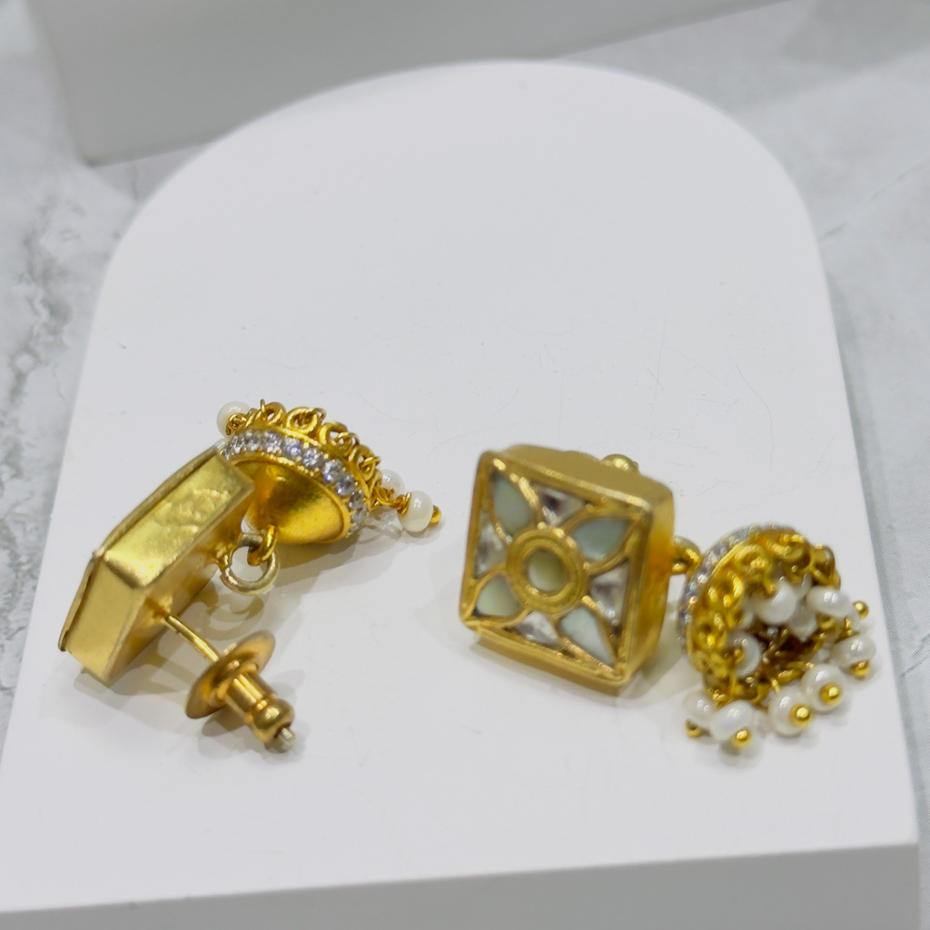 These handcrafted Polki style earrings celebrate timeless Indian artistry in modern form. Set in 925 Sterling Silver, each earring showcases uncut Cubic Zircon stones with natural pearl borders that exude royal charm. The intricate silver framework ensures balance between tradition and minimalism, making them ideal for weddings, festive gatherings, or pairing with both ethnic and Indo-western ensembles. A versatile design that complements sophistication with subtle sparkle.