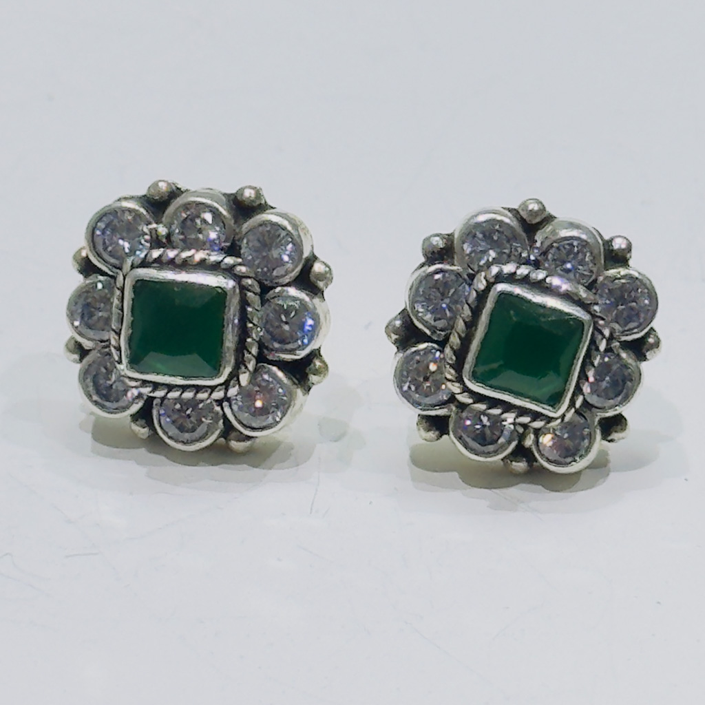 These exquisite Polki-style stud earrings combine the vibrance of green onyx with the subtle brilliance of white zircons. Crafted in 925 Sterling Silver with an oxidised finish, the floral motif frames a square-cut green onyx at the center, encircled by uncut Polki-style zircons. The intricate rope-textured detailing adds to its artisanal depth, making it a perfect blend of heritage and sophistication. Ideal for festive wear, traditional occasions, or an elegant touch to everyday style.