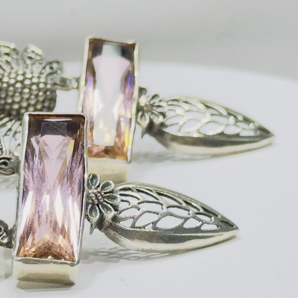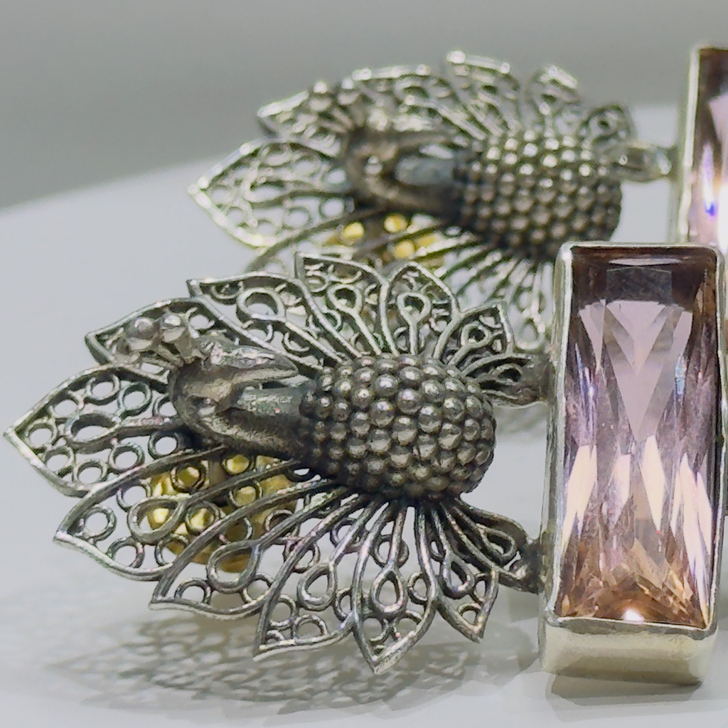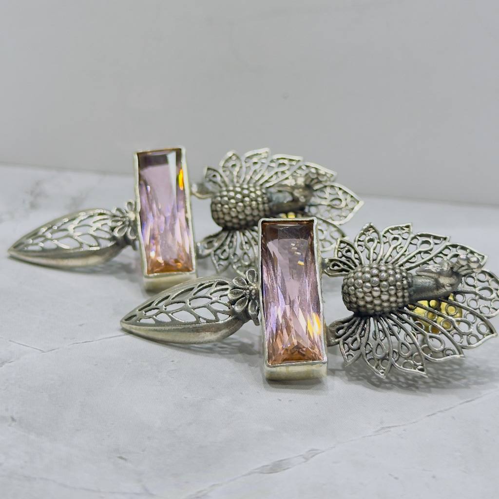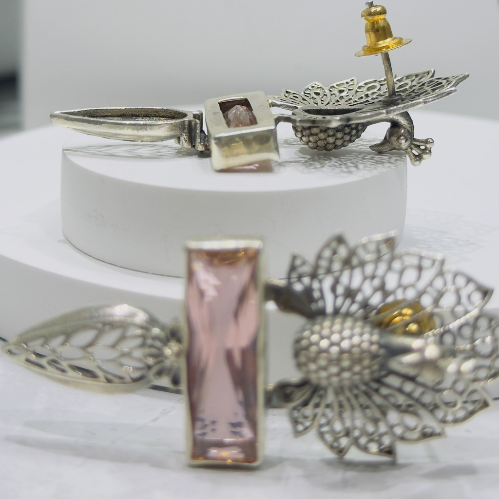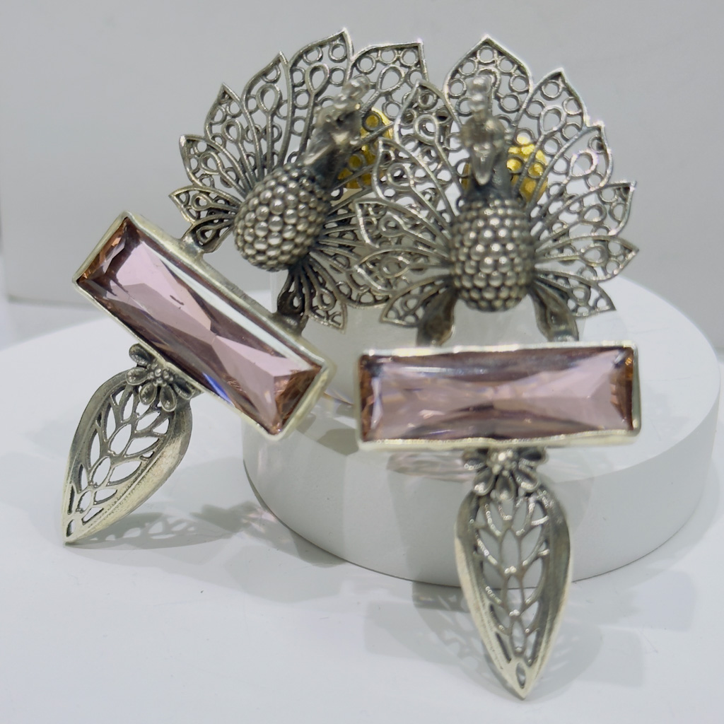 Inspired by the elegance of peacocks, these oxidized silver earrings are an ode to heritage craftsmanship and modern grace. Each piece features a finely detailed peacock motif, accentuated with a soft pink faceted rose quartz gemstone that adds a hint of color and sophistication. Subtle gold plating on the filigree feathers enhances their intricate charm. Lightweight yet bold, these earrings transition beautifully from daytime wear to evening elegance, making them a true collector’s piece from Amaahe’s art-inspired silver line.