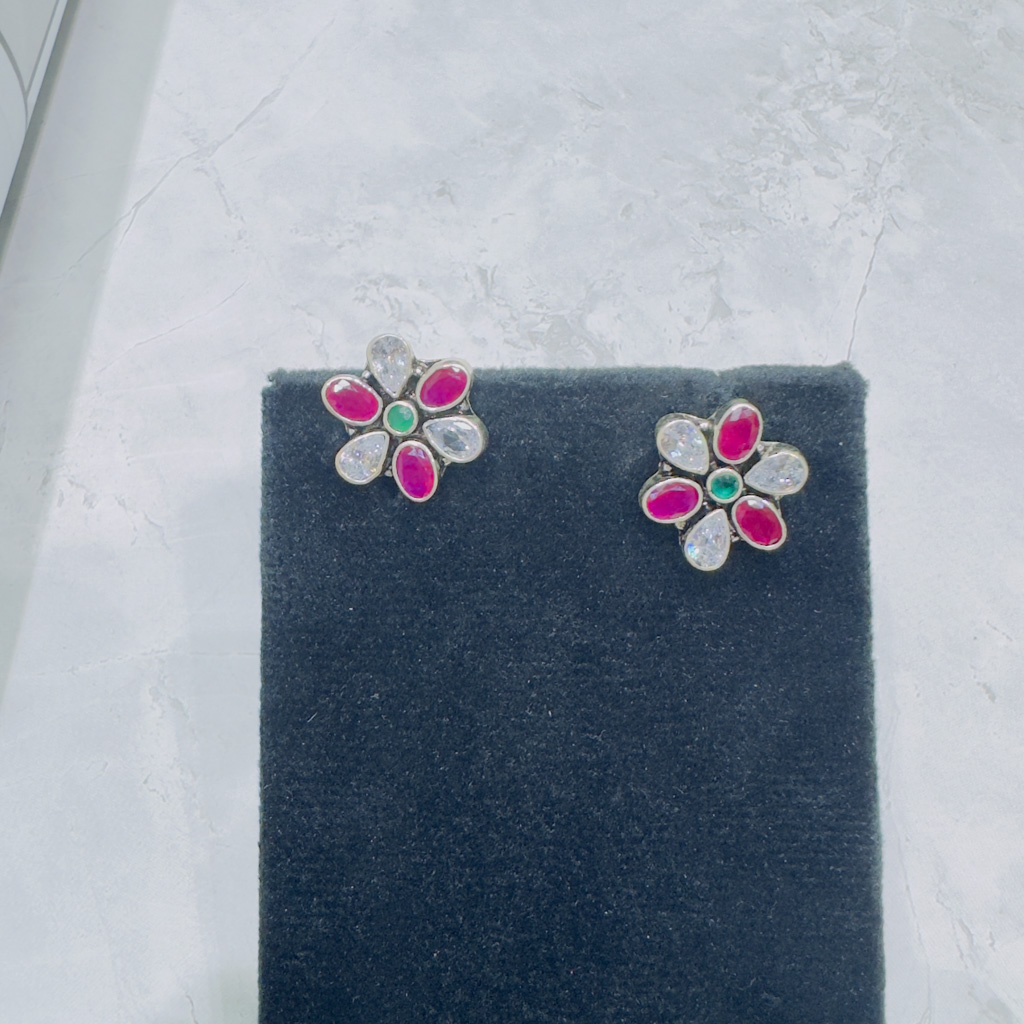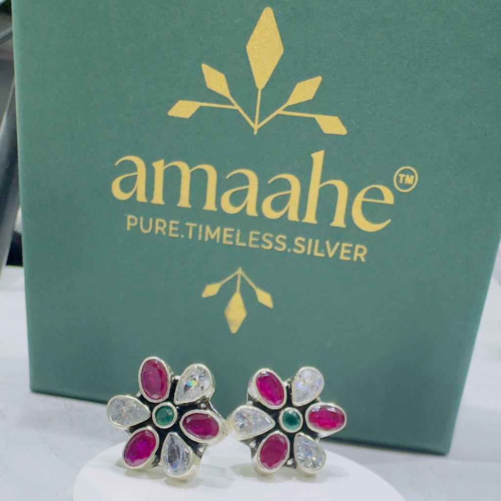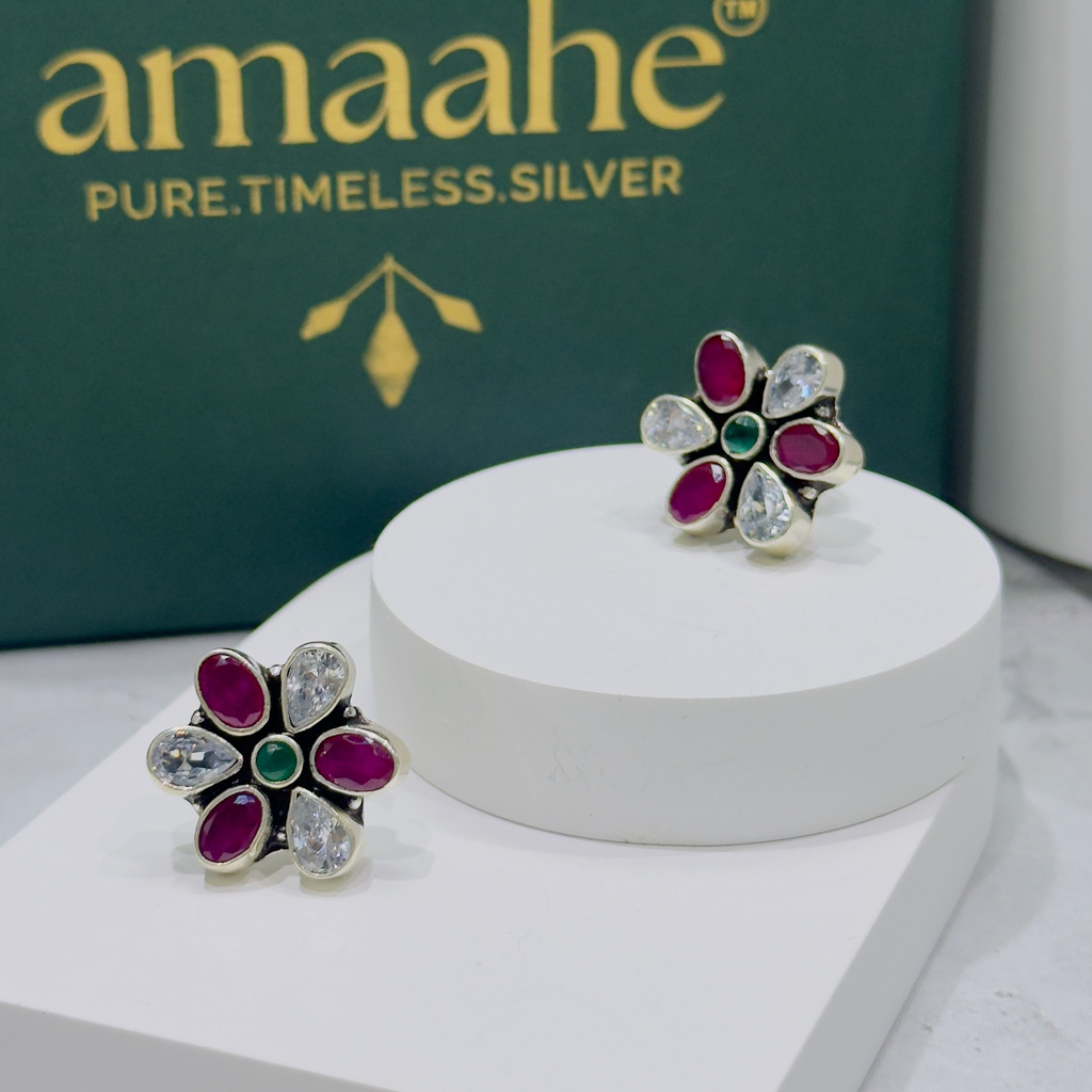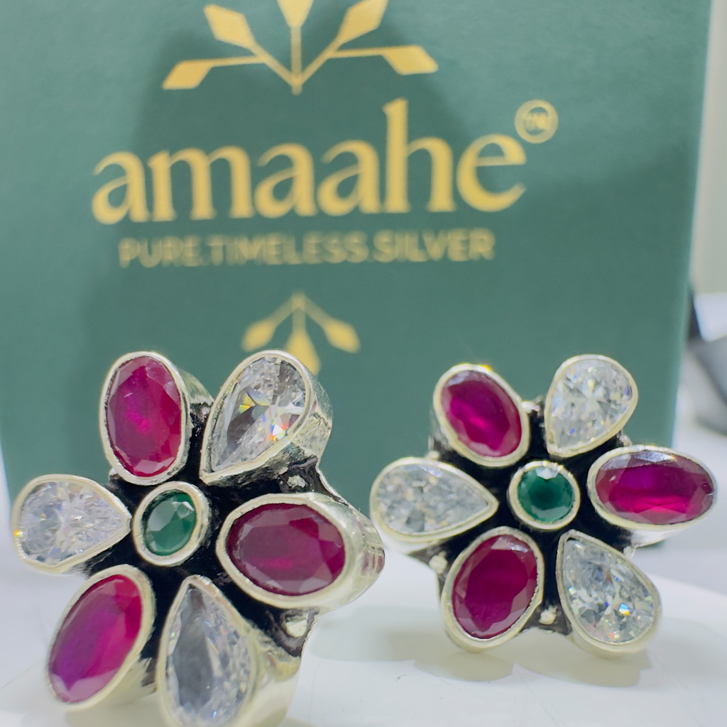 These handcrafted floral earrings by Amaahe bring together artistry and color in a timeless design. Set in 925 sterling silver with a gold-polished finish, each petal features alternating ruby and quartz stones, centered with a delicate emerald. The dual-tone effect of gold and oxidised silver adds an old-world allure while keeping the piece fresh and versatile. Whether paired with a saree or a minimal modern outfit, these earrings offer the perfect balance of sophistication and vibrance.
